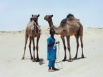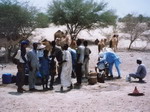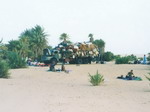 au loin. A 10 heures, nous faisons halte à l'oasis d'AGADEM. L'endroit est habité par des nomades qui profitent du point d'eau. Pas d'ombre, on doit encore s'installer sous le camion. Autour de nous, chameaux et ânes se baladent tranquillement. Nous sommes à mi-parcours de NGUIGMI. Le chef du camion, Ali, achète un chameau. Le pauvre ne tarde pas à être découpé en morceaux
