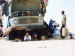 sur place. Il sera bientôt dans nos assiettes. Pendant que certains préparent la cuisine, Moussaillon me verse de l'eau sur la tête et je me fais un shampoing. Bien sur, tout le monde rigole ! Il est bientôt 15heures, chacun s'affaire toujours à la préparation du chameau. Il faut le manger tant qu'il est frais. Toute cette petite agitation donne un air de fête autour du camion. Un peu avant 17 heures, on peut enfin se régaler de morceaux de viandes bien tendres. On ne repart qu'à 18 heures. A 19 heures, comme toujours, tout le monde descend pour la prière sauf nous qui restons bien sagement sur le toit. Finalement, nous passons la nuit ici. "Le camion est un petit peu en panne", annonce le chauffeur. Sur ce, Cousteau, notre super mécanicien se met au travail. Au menu, pâtes au chameau et sable, suivi d'un thé. La nuit est douce, plus chaude que les précédentes.