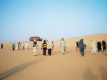 Au lever du soleil, les dunes de sable apparaissent. Peu après, arrêt mécanique. On en profite pour grignoter quelques biscuits. Balade sur les dunes. Nous voici en plein désert, c'est impressionnant. Tiens, un camion à disparu, celui qui transportait l'escorte. Nous voici seuls avec l'autre camion ! A 9 heures 45, on repart. Mais pas pour bien longtemps.