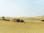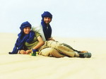 on se lance, c'est l'heure du départ. A 9 heures 45, nous nous arrêtons non loin de la ville, à l'écart. Nous ne repartirons que ce soir, quand il fera plus fais. En attendant, on s'installe à l'ombre. Des femmes nous ont préparé des pâtes (au sable !). Mais on se régale. Puis repos jusqu'à 14 heures 45. Le camion progresse lentement, les paysages sont chouettes. Du sable, des dunes, des rochers. Tout cela forme un étrange mélange. Ça y est, les dunes se dressent et représentent de grands obstacles à franchir. On les passe au prix de nombreuses manœuvres. Le chauffeur tente même en marche arrière ! A 19 heures, prière et bivouac pour la nuit. Nous voici déjà adoptés, le cuisinier nous apporte le thé, des biscuits et des pâtes. Alors que nous venons de finir le plat, une dame nous apporte une autre grande écuelle de pâtes. Plus faim ! On s'endort sous les étoiles...