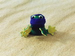 (notre grenouille verte avec pattes jaunes) qui veut se dégourdir les jambes aussi. La voilà elle aussi parée de son turban bleu touareg. Deux chameaux passent, guidés par un touareg. Ainsi, ils vont à BILMA. On ne repart qu'à 10 heures 30. Mais 15 minutes plus tard, autre crevaison ! A 11 heures 30, nous reprenons la piste maintenant balisée. Nous avons fait le plus difficile. Puis on roule de nouveau jusqu'à 14 heures 15, avec cependant quelques haltes pour le moteur. Il fait si chaud et durant les longs moments d'attente, on ne peut que souffrir en silence. C'est maintenant la pose repas à l'ombre du camion. Ce serait bien si on avait un tout petit peu d'air. Nos visas sont aujourd'hui périmés. En principe, nous devrions être sortis du pays. Nous voici en situation irrégulière ! Idée Fixe, le cuisinier nous apporte encore des pâtes au chameau, puis on boit le délicieux thé préparé par Moussaillon. Nous sommes près du puit Koussa Arma. A 17 heures 30, au moment de partir, enlisement. A 18 heures nous commençons à rouler et une demi-heure plus tard nous sommes déjà arrêtés pour le refroidissement du moteur. Bon, "aya, aya, aya...." (aller, aller, on y va) Ça repart doucement... A 19 heures, ne pas oublier la prière, c'est sacré. Puis nous roulons de nouveau jusqu'à 21 heures 30, après avoir passé le point d'eau Bélabirim. Enfin, nous nous installons pour la nuit. La journée fut chaude et longue. Le temps de manger du riz, et nous nous couchons à minuit 30.