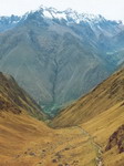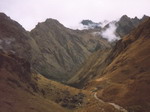 Le ciel est bleu, dégagé, c'est le temps idéal pour apprécier pleinement la randonnée. Puis le chemin descend. Au bout, d'autres ruines. Entourés par les montagnes, nous écoutons Juan, en replongeant dans l'histoire du pays. Après le repas, nous repartons sur un sentier étroit. Le terrain est plus plat, à présent c'est de la balade, sans effort particulier à fournir. On prend notre temps, on s'arrête souvent écouter et admirer le paysage qui change sans cesse. A un endroit, Juan nous désigne le Mont MACHU PICHU. Puis nous entamons une grande descente. 1 heures 30 de marches plus ou moins hautes à descendre jusqu'au refuge qui sera notre étape pour la nuit. Une pluie fine se met à tomber, mais ça ne dure pas. A 16 heures 30, nous arrivons au camp. Les tentes sont déjà plantées. Tous les groupes différents se retrouvent ici, il y a même une grande salle pour abriter tout le monde. A 17 heures, le groupe est réuni et Juan nous emmène non loin de là voir d'autres ruines. Au retour, thé, pop-corn et biscuits nous attendent.