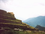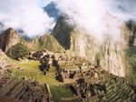 Réveil à 4 heures. Dès 5 heures, il fait encore nuit et nous partons, lampe à la main. Le MACHU PICHU n'est plus qu'à 1 heures 30 de marche. Nous nous essoufflons en grimpant un escalier assez raide. Le brouillard entoure les montagnes et désépaissit doucement. Nous attendons un moment que la brume dévoile enfin le MACHU PICHU. La végétation est dense, il fait chaud et humide. Un peu plus bas, la vue est encore meilleure. Le brouillard donne au site un aspect mystérieux, sauvage, secret.
