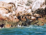 noirs et blancs. Des mignons Pingouins de Humboldt ! On était si déçus de ne pas avoir pu en voir en Argentine, en voici enfin quelques uns devant nous. Plus loin, des lions de mer. Certains sont étalés sur les rochers, d'autres nagent, jouent ou se battent. Il y en a des centaines, partout. On ne se lasse pas de les observer dans cet environnement brumeux. Ils sautent autour du bateau. Pendant ce temps, des oiseaux blancs volent autour de nous. De retour à l'embarcadère, un autre bus nous conduit dans le Parc National de Paracas. La mer fait contraste avec le désert. On se balade le long d'une plage immense et pénétrons dans une roche. La balade se termine près d'un lac pour observer les flamants roses. A PISCO, réservation des billets de bus pour LIMA.