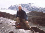 porteurs. Ceux-ci se chargent de leur gros fardeau. Nous n'avons que nos petits sacs à porter (et Froggy !). Nous empruntons un petit sentier. Au fond, un sommet enneigé domine la verdure. A 12 heures 30, halte pour le repas suivi d'un Maté de Coca. Puis vers 14 heures, nous repartons. On grimpe, on redescend, les paysages sont verts. A 16 heures 45, nous arrivons au campement, les tentes sont déjà montées par les porteurs, le thé et les pop-corn sont prêts. La nuit tombe rapidement. Mark, un Anglais, arrive soudain les bras chargés de bières. Il en offre à tout le monde, c'est la fête ! Il est 18 heures 30, nous discutons tous ensemble en attendant le repas. Et à 20 heures, chacun se glisse sous les tentes.
