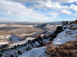 nous prévoyons une balade dans la neige. L'après midi, Deborah nous propose une promenade dans le secteur montagneux le plus proche. On gare la voiture puis empruntons un sentier enneigé et parfois gelé. Nous avançons dans les collines et avons un très beau panorama sur Denver et ses environs. Puis nous récupérons la voiture et Deborah nous conduit à un théâtre de plein air, entouré de roches immenses. Ce cadre si naturel est impressionnant. Nous rentrons à la maison, Philip est arrivé mais doit repartir travailler un peu. Alors Deborah nous accompagne à la librairie où nous achetons un guide de voyage sur l'Amérique Centrale. Puis nous allons faire quelques courses et rentrons. Nous partageons tous les quatre un bon repas au champagne. Un régal !