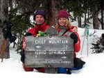 bord de la route, nous chaussons les raquettes puis commençons à grimper dans la forêt. Ca monte dur… Soudain, le ciel se couvre, il se met à neiger… Plus haut, on doit laisser les raquettes et poursuivre à pied. Le vent est de plus en plus fort et glacial. Betty a les cheveux gelés et Philip la barbe toute blanche ! On atteint le sommet de Chief Mountain, mais on ne s'attarde pas. La descente est difficile, face au vent, avec la neige qui gèle sur